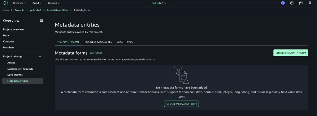 publish-1, chọn Metadata entities dưới Project catalog trong navigation pane. - Trên tab Metadata forms, chọn CREATE METADATA FORM.