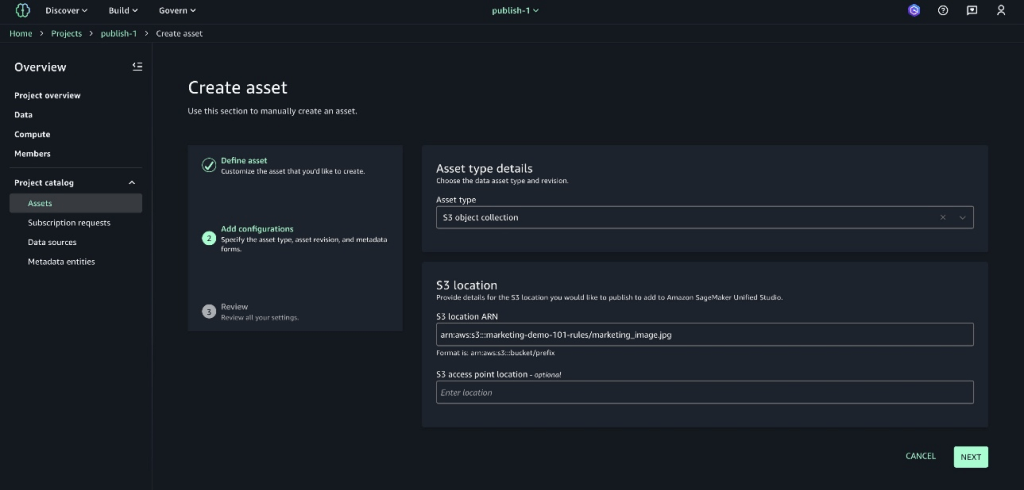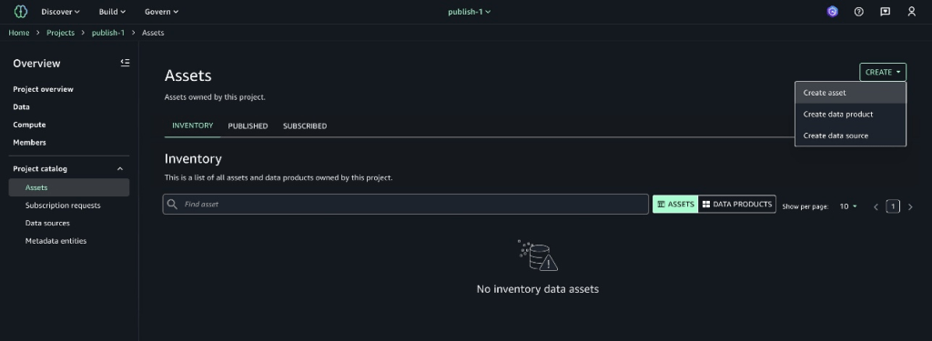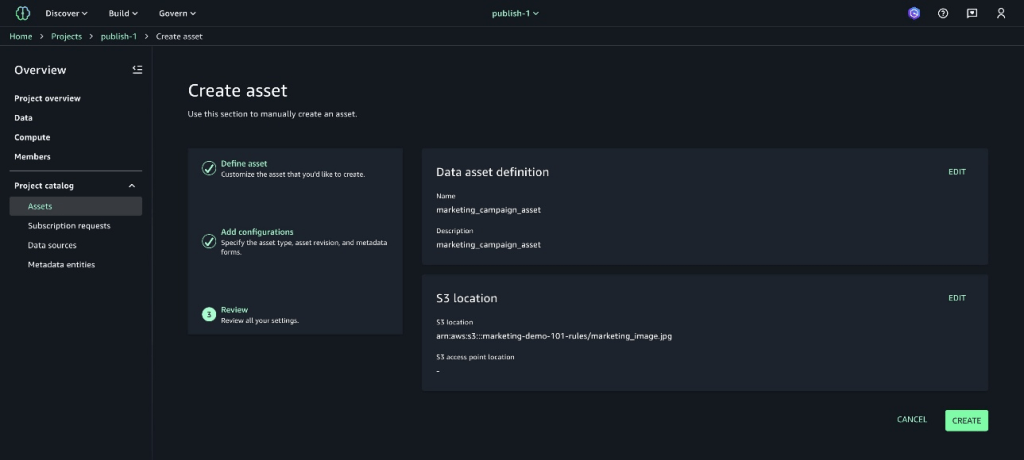 Các rule hoạt động trên các assets được quản lý bởi SageMaker Catalog hoặc trên các custom assets. Để tạo một asset, hãy hoàn thành các bước sau: