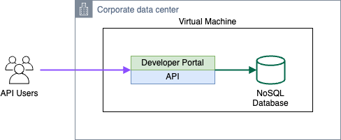 Ứng dụng phục vụ các yêu cầu API và cơ sở dữ liệu NoSQL đều chạy trên cùng một máy chủ. Triển khai phần mềm và bảo trì hệ điều hành được thực hiện thủ công bằng Secure Shell (SSH) – một thiết lập tự động hóa thấp điển hình cũng bao gồm thời gian ngừng hoạt động.