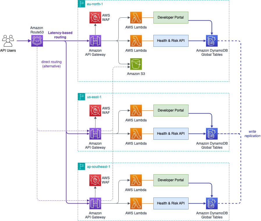 Dịch vụ API có hai thành phần: một cổng thông tin dành cho nhà phát triển và API tính toán điểm sức khỏe và rủi ro. Cơ sở dữ liệu chỉ cần thiết cho các API key, tham số thuật toán, hạn ngạch và số liệu thống kê sử dụng. Dữ liệu sức khỏe được xử lý theo khu vực bởi lớp tính toán nhưng không được lưu trữ vĩnh viễn, mở ra cơ hội cho một cơ sở dữ liệu phân tán: Amazon DynamoDB global tables là lựa chọn hoàn hảo cho giải pháp. Các thao tác ghi được phân phối đến tất cả các Region được kết nối, trong khi các thao tác đọc là cục bộ, cung cấp độ trễ thấp để tuân thủ các thỏa thuận mức dịch vụ (SLA) của dacadoo.