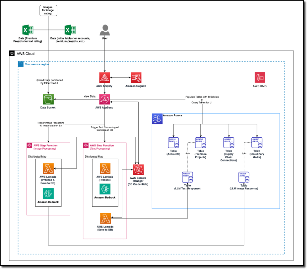 Hệ thống được truy cập thông qua một ứng dụng web React TypeScript được lưu trữ trên AWS Amplify, ứng dụng này tích hợp với Amazon Cognito để xác thực an toàn. Ứng dụng sử dụng AWS Step Functions để xử lý hình ảnh và phân tích văn bản. Các quy trình làm việc của Step Functions tận dụng Amazon Bedrock cho generative AI và large language models (LLMs) nhằm tạo ra điểm đánh giá tác động và bản tóm tắt câu chuyện.