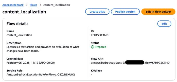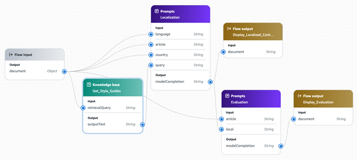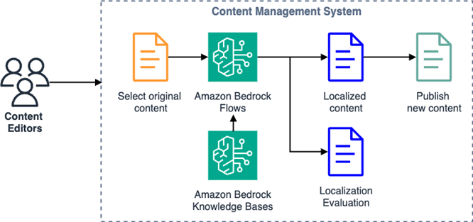 Chúng tôi sẽ trình bày cách bạn có thể tận dụng các tính năng của Amazon Bedrock (như Flows, Prompt Management và các mô hình nền tảng khác nhau) để nhanh chóng xây dựng và thử nghiệm một quy trình làm việc (workflow). Quy trình này sẽ tiếp nhận nội dung hiện có, cung cấp bản sao đã được bản địa hóa và đưa ra đánh giá về những thay đổi đã thực hiện để biên tập viên xem xét.