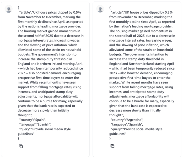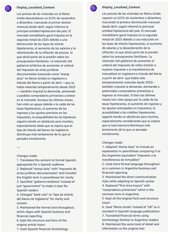 Prompt thứ hai đánh giá nội dung gốc và nội dung đã được bản địa hóa để cung cấp bản đánh giá cho biên tập viên. Để xác nhận tính độc lập với prompt bản địa hóa, prompt này sử dụng Amazon Nova Pro. Amazon Nova Pro là một mô hình đa phương thức (multimodal) có khả năng cao với sự kết hợp tốt nhất giữa độ chính xác, tốc độ và chi phí cho nhiều loại tác vụ—hỗ trợ hơn 200 ngôn ngữ.