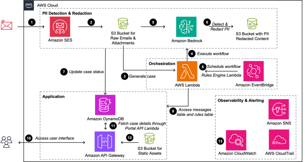 - Tự động phát hiện và biên tập PII cho cả nội dung email và tệp đính kèm bằng cách sử dụng Amazon Bedrock Data Automation và Guardrails, đảm bảo rằng dữ liệu nhạy cảm được bảo vệ nhất quán trên các loại nội dung khác nhau.