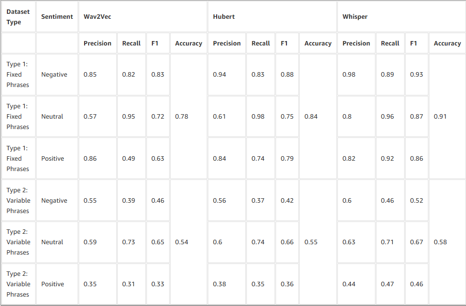 - Loại 1 – Vì các cụm từ giống nhau được lặp lại với các ngữ điệu cảm xúc khác nhau, các mô hình tập trung nhiều hơn vào các tín hiệu âm thanh hơn là nội dung. Điều này dẫn đến độ chính xác cao hơn—đặc biệt trong việc phân biệt các trạng thái kích thích cao (tức giận, phấn khích) với các trạng thái kích thích thấp (buồn bã, bình tĩnh).