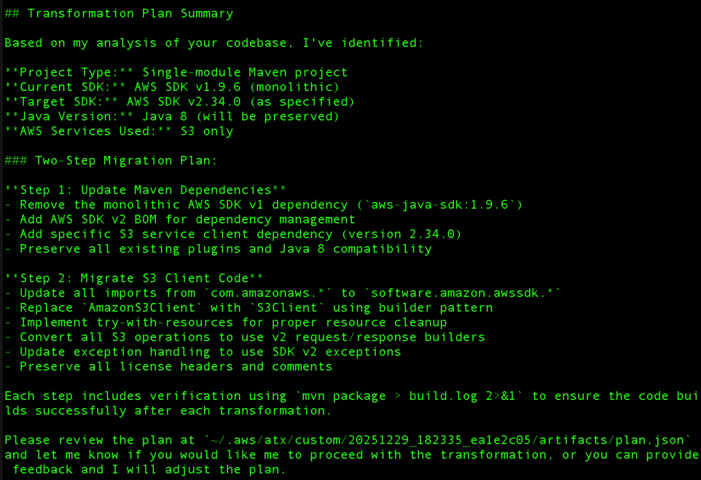 Kế hoạch chuyển đổi sẽ được phác thảo trong một tệp plan.json trong thư mục được chỉ định trong đầu ra (Hình 1). Chúng tôi đề xuất xem xét kỹ lưỡng kế hoạch chuyển đổi để đảm bảo nó bao gồm tất cả các cập nhật dự kiến. Nếu cần điều chỉnh, phản hồi có thể được cung cấp thông qua giao diện CLI. AWS Transform custom kết hợp tất cả phản hồi được cung cấp để tinh chỉnh kế hoạch chuyển đổi trước khi tiếp tục.