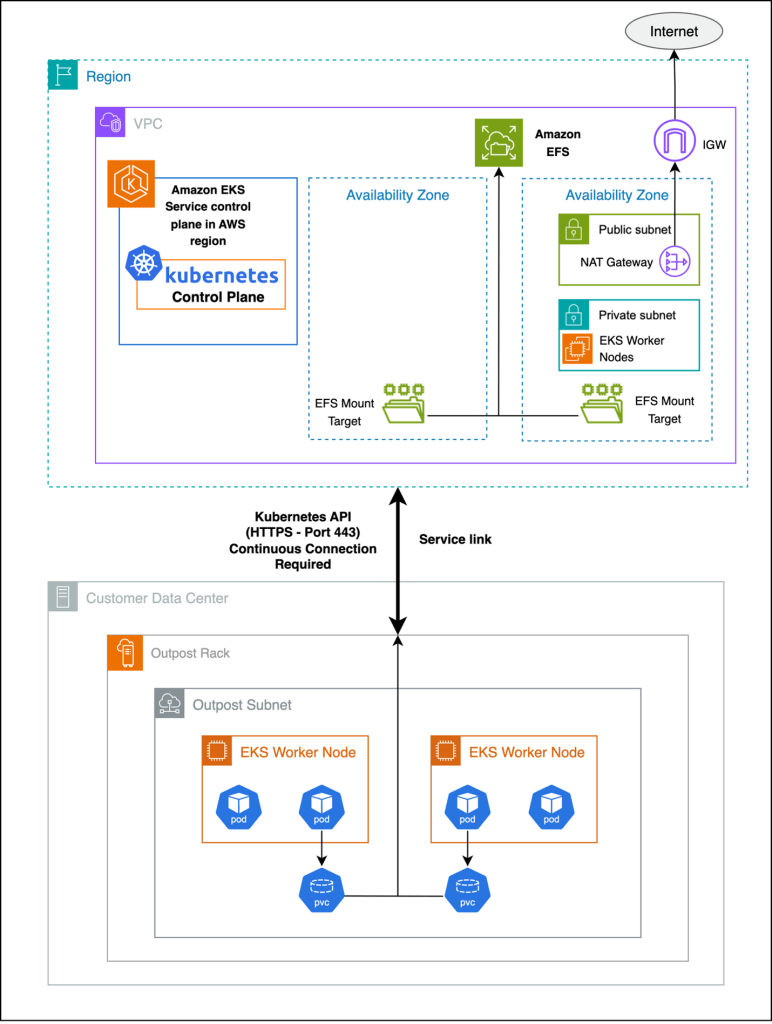 Amazon Elastic File System (Amazon EFS) cung cấp bộ nhớ tệp có thể mở rộng, được chia sẻ có thể truy cập trên nhiều AWS Availability Zone (AZ) và môi trường tại chỗ. Mặc dù Amazon EFS với Amazon EKS trên Outposts duy trì các quy trình thiết lập tương tự như các triển khai đám mây tiêu chuẩn, nhưng có một sự phụ thuộc quan trọng vào kết nối service link giữa Outposts của bạn và AWS Region. Amazon EFS không phải là một dịch vụ được hỗ trợ cục bộ trên Outposts, vì vậy cần có kết nối đến AWS Region để sử dụng dịch vụ này với Outpost của bạn.