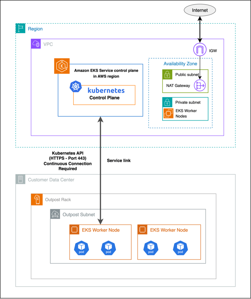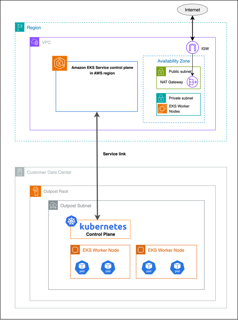 Các cụm mở rộng Amazon EKS trên Outposts cung cấp một giải pháp mạnh mẽ cho các tổ chức muốn sử dụng lợi ích của Kubernetes trong khi vẫn duy trì một số workload tại chỗ, như thể hiện trong hình sau. Kiến trúc lai này cho phép các doanh nghiệp mở rộng cụm EKS của họ từ AWS Cloud đến các trung tâm dữ liệu hoặc vị trí biên của riêng họ bằng cách sử dụng Outposts. Control plane của Kubernetes vẫn nằm trong AWS Region, cung cấp khả năng quản lý tập trung và hưởng lợi từ cơ sở hạ tầng AWS trên đám mây và trên Outpost.