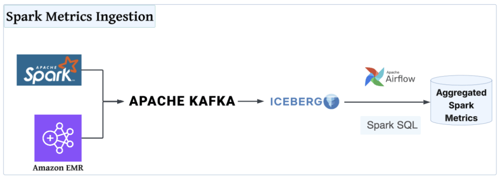 Framework listener mở rộng của chúng tôi lấp đầy những khoảng trống này bằng cách hợp nhất và làm phong phú dữ liệu đo từ xa bằng các thẻ môi trường và cấu hình, xây dựng một lịch sử bền vững, có thể truy vấn và tương quan các sự kiện trên biểu đồ thực thi. Nó giải thích tại sao các task thất bại, xác định nơi xảy ra áp lực bộ nhớ hoặc CPU, so sánh các cấu hình dự định với việc sử dụng thực tế và đưa ra các đề xuất tinh chỉnh rõ ràng, có thể lặp lại để các nhóm có thể thiết lập hành vi cơ bản, giảm thiểu lãng phí và giải quyết vấn đề nhanh hơn. Sơ đồ kiến trúc sau đây minh họa luồng của pipeline thu thập chỉ số Spark.