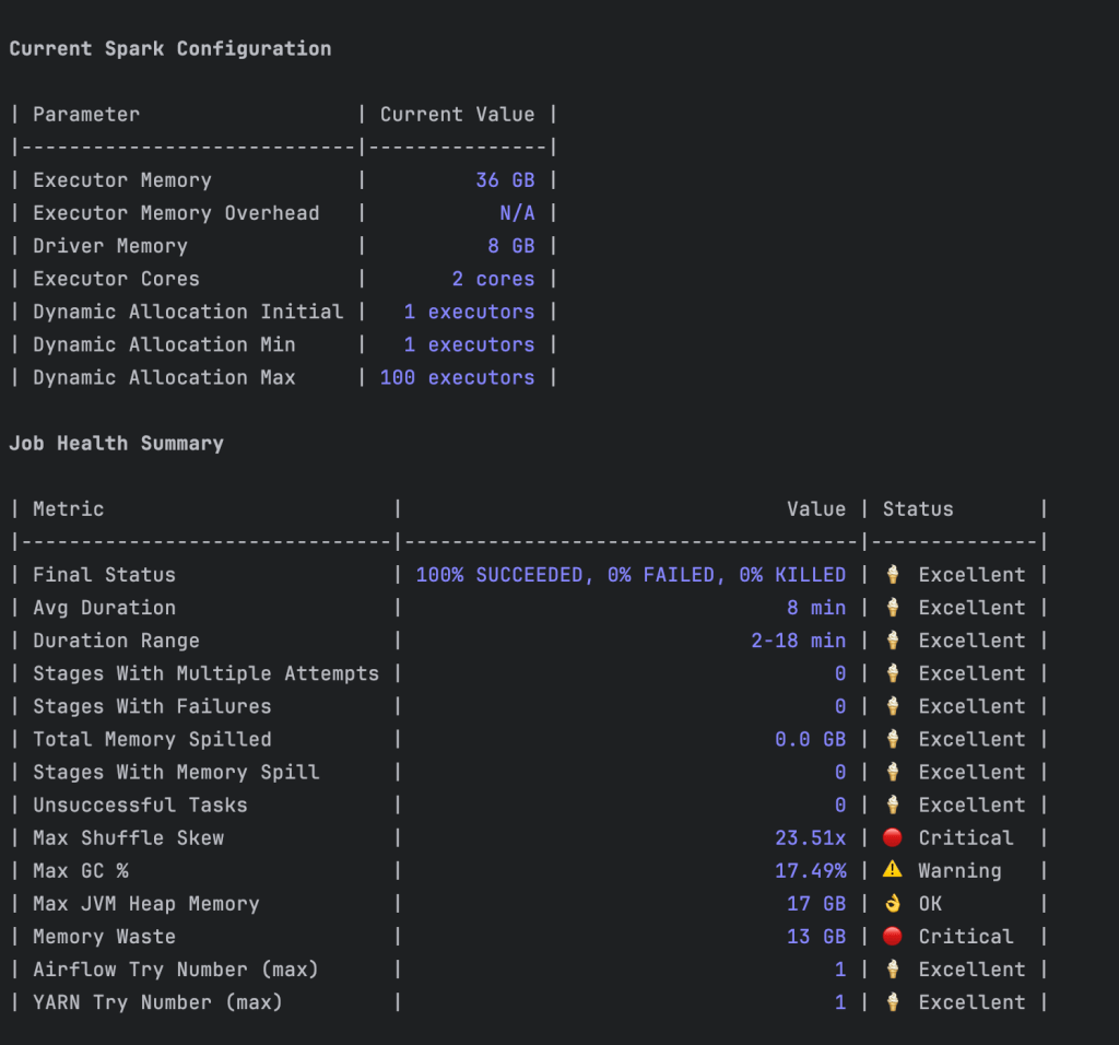 Một Spark SQL pipeline được điều phối bởi Apache Airflow chuyển đổi dữ liệu này thành những thông tin chi tiết có thể hành động, làm nổi bật các nút thắt cổ chai về hiệu suất và các điểm lỗi. Để tích hợp các chỉ số này vào quy trình tinh chỉnh của nhà phát triển, chúng tôi hiển thị một công cụ chỉ số và một prompt tùy chỉnh thông qua máy chủ giao thức ngữ cảnh mô hình phân tích nội bộ (MCP) của chúng tôi. Điều này cho phép tích hợp liền mạch với các công cụ mã hóa được hỗ trợ bởi AI như Cursor hoặc Claude Code.