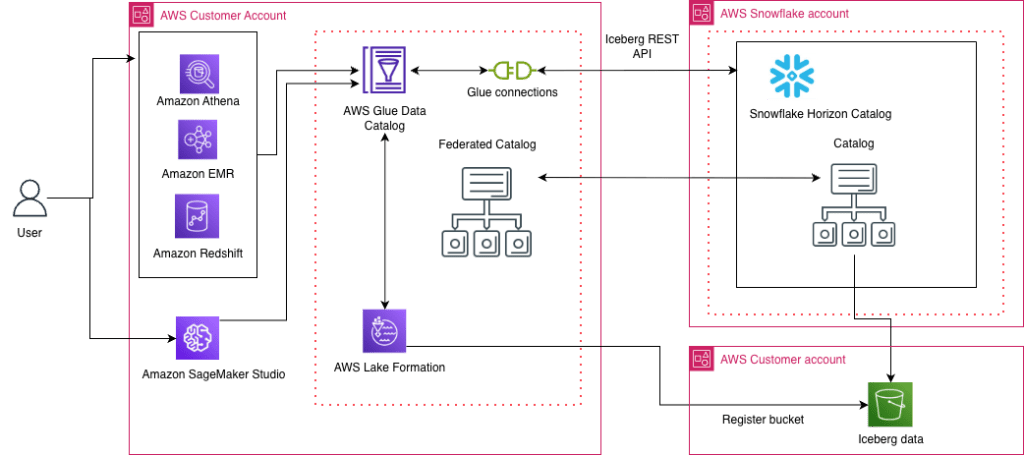 Hình 1: Sơ đồ kiến trúc cho thấy sự tích hợp giữa các dịch vụ AWS và Snowflake bằng cách sử dụng các kết nối danh mục liên kết thông qua Apache Iceberg REST API.