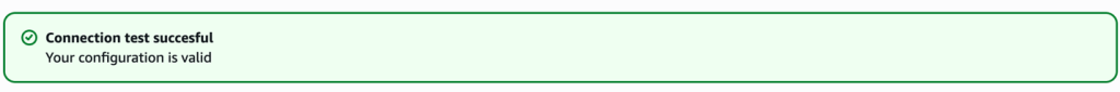 Hình 3: Biểu ngữ thành công màu xanh lá cây hiển thị “Connection test successful” với biểu tượng dấu kiểm, xác nhận cấu hình AWS hợp lệ.