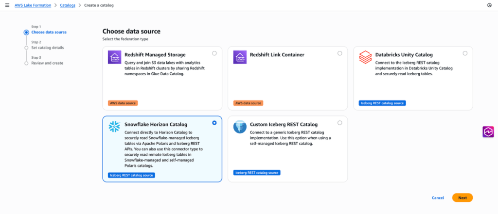 Hình 2: Ảnh chụp màn hình bảng điều khiển AWS Lake Formation hiển thị Bước 1 của trình hướng dẫn tạo danh mục với năm tùy chọn loại liên kết, Snowflake Horizon Catalog được chọn.