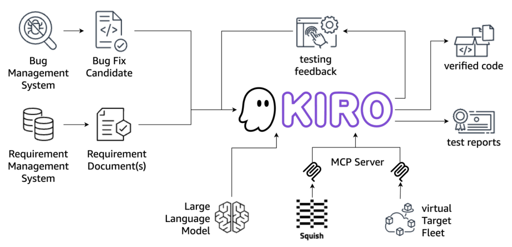 Phát triển theo đặc tả được hỗ trợ bởi AI của Kiro tạo ra các script kiểm thử Squish ban đầu từ các đặc tả ngôn ngữ tự nhiên và các script kiểm thử stub hiện có. Squish cung cấp framework kiểm thử mạnh mẽ, độc lập với nền tảng để thực thi và xác thực các script này. Kết quả thực thi được chuyển ngược lại cho Kiro thông qua máy chủ Squish Model Context Protocol (MCP). Vòng lặp phản hồi trực tiếp này cho phép Kiro tự động sửa một số lỗi trong các script kiểm thử được tạo, phát hiện lỗi sớm với chi phí thấp hơn đáng kể so với chi phí sửa lỗi trong sản xuất.