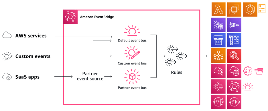 Amazon EventBridge là một dịch vụ bus sự kiện phi máy chủ giúp đơn giản hóa việc tích hợp ứng dụng. Các nhà sản xuất xuất bản các sự kiện trên một bus và EventBridge định tuyến chúng đến các người tiêu dùng quan tâm dựa trên các quy tắc có thể cấu hình. EventBridge gọi các người tiêu dùng là đích và cung cấp hơn 20 tích hợp sẵn.