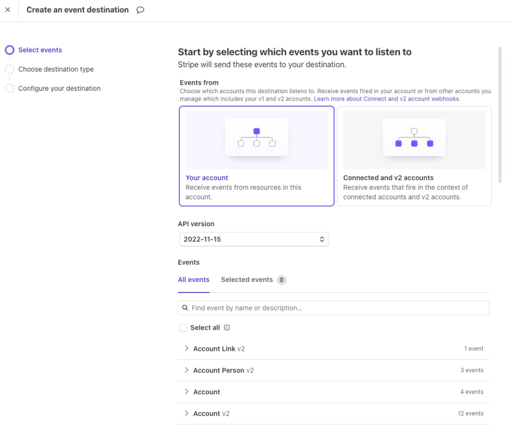 - Chọn nút +Add destination. Stripe hỗ trợ hai cấu hình để gửi sự kiện từ: Your account và Connected accounts. Để đơn giản, hãy chọn Your account để lắng nghe các sự kiện từ tài khoản của riêng bạn.