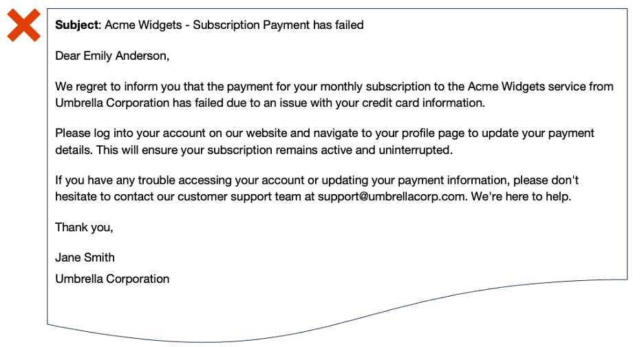 Sau đây là ví dụ về email được gửi cho người dùng cuối khi khoản thanh toán hàng tháng không thành công.