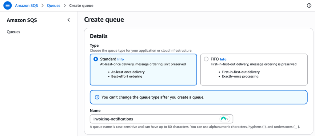 Điều hướng đến Amazon SQS sẽ đưa bạn đến trang Queues, sau đó: