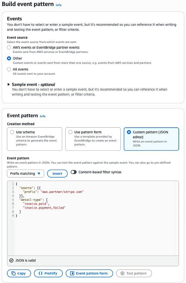 { "source": [{ "prefix": "aws.partner/{your-payment-processor}" }], "detail-type": [ "invoice.paid", "invoice.payment_failed" ]}