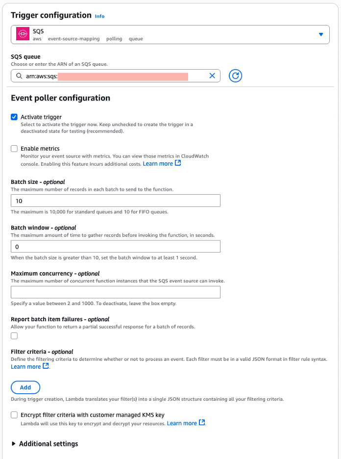 Tạo một hàm Lambda là một quy trình được ghi lại rõ ràng. Để bắt đầu, hãy làm theo các bước từ trang tài liệu Create your first Lambda function. Hãy đi sâu vào tích hợp với SQS và các cài đặt có sẵn.