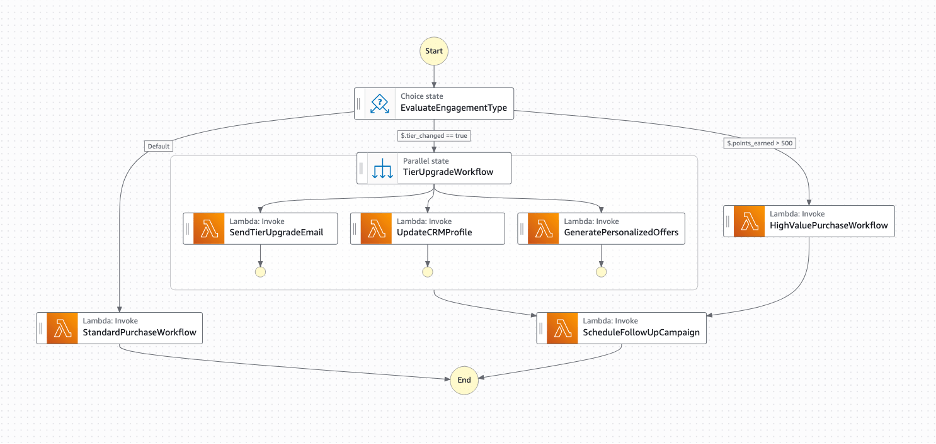 { "Comment": "Umbrella Loyalty Customer Engagement Workflow", "StartAt": "EvaluateEngagementType", "States": { "EvaluateEngagementType": { "Type": "Choice", "Choices": [ { "Variable": "$.tier_changed", "BooleanEquals": true, "Next": "TierUpgradeWorkflow" }, { "Variable": "$.points_earned", "NumericGreaterThan": 500, "Next": "HighValuePurchaseWorkflow" } ], "Default": "StandardPurchaseWorkflow" }, "TierUpgradeWorkflow": { "Type": "Parallel", "Branches": [ { "StartAt": "SendTierUpgradeEmail", "States": { "SendTierUpgradeEmail": { "Type": "Task", "Resource": "arn:aws:lambda:region:account:function:dev-send-tier-upgrade-email", "Retry": [ { "ErrorEquals": ["Lambda.ServiceException", "Lambda.AWSLambdaException"], "IntervalSeconds": 2, "MaxAttempts": 3, "BackoffRate": 2.0 } ], "End": true } } }, { "StartAt": "UpdateCRMProfile", "States": { "UpdateCRMProfile": { "Type": "Task", "Resource": "arn:aws:lambda:region:account:function:dev-update-crm-profile", "Retry": [ { "ErrorEquals": ["Lambda.ServiceException", "Lambda.AWSLambdaException"], "IntervalSeconds": 2, "MaxAttempts": 3, "BackoffRate": 2.0 } ], "End": true } } }, { "StartAt": "GeneratePersonalizedOffers", "States": { "GeneratePersonalizedOffers": { "Type": "Task", "Resource": "arn:aws:lambda:region:account:function:dev-generate-tier-offers", "Retry": [ { "ErrorEquals": ["Lambda.ServiceException", "Lambda.AWSLambdaException"], "IntervalSeconds": 2, "MaxAttempts": 3, "BackoffRate": 2.0 } ], "End": true } } } ], "Next": "ScheduleFollowUpCampaign" }, "HighValuePurchaseWorkflow": { "Type": "Task", "Resource": "arn:aws:lambda:region:account:function:dev-high-value-engagement", "Retry": [ { "ErrorEquals": ["Lambda.ServiceException", "Lambda.AWSLambdaException"], "IntervalSeconds": 2, "MaxAttempts": 3, "BackoffRate": 2.0 } ], "Next": "ScheduleFollowUpCampaign" }, "StandardPurchaseWorkflow": { "Type": "Task", "Resource": "arn:aws:lambda:region:account:function:dev-standard-purchase-confirmation", "Retry": [ { "ErrorEquals": ["Lambda.ServiceException", "Lambda.AWSLambdaException"], "IntervalSeconds": 2, "MaxAttempts": 3, "BackoffRate": 2.0 } ], "End": true }, "ScheduleFollowUpCampaign": { "Type": "Task", "Resource": "arn:aws:states:::lambda:invoke.waitForTaskToken", "Parameters": { "FunctionName": "arn:aws:lambda:region:account:function:dev-schedule-follow-up-campaign", "Payload": { "customer_id.$": "$.customer_id", "campaign_type.$": "$.current_tier", "delay_hours": 72, "task_token.$": "$$.Task.Token" } }, "End": true } }}