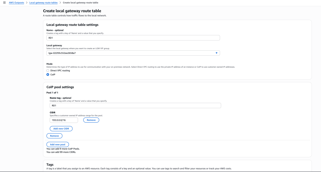 Với việc giới thiệu nhiều miền định tuyến LGW trên Outposts, giờ đây bạn có thể tạo nhiều miền định tuyến và liên kết một hoặc nhiều VLAN với mỗi miền định tuyến. Điều này cho phép bạn tích hợp Outposts rack của mình vào sơ đồ mạng tại chỗ hiện có. Mỗi miền định tuyến LGW sẽ có một Nhóm Giao diện Ảo LGW (VIF Group) và một Bảng Định tuyến LGW (LGW Route Table) duy nhất, cho phép cô lập lưu lượng mạng logic. Bạn có thể có tối đa 10 miền định tuyến đang hoạt động với các bảng định tuyến sử dụng chế độ định tuyến DVR hoặc CoIP, và bạn có thể thực hiện các thay đổi đối với các miền định tuyến này khi cần một cách tự phục vụ, cho phép linh hoạt mạng khi kiến trúc được cập nhật theo thời gian. Các cài đặt này có thể được tìm thấy trong bảng điều khiển AWS Outposts dưới tab Networking trong menu.