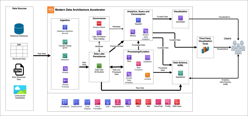 Các chiến lược quản trị dữ liệu hiện đại thường sử dụng data lake để cung cấp kiểm soát và khả năng hiển thị tập trung. AWS cung cấp một giải pháp toàn diện thông qua Modern Data Architecture Accelerator (MDAA), mà bạn có thể sử dụng để giúp bạn nhanh chóng triển khai và quản lý các kiến trúc nền tảng dữ liệu với các kiểm soát bảo mật và quản trị tích hợp. Hình 2 cho thấy kiến trúc tham chiếu MDAA.