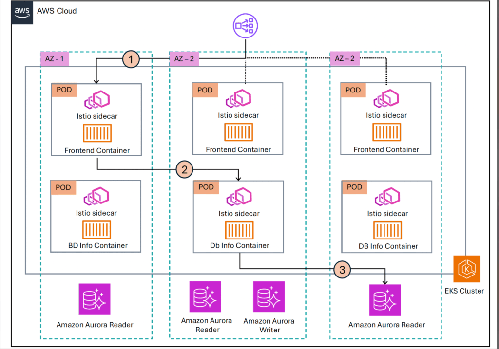 Đối với Amazon EKS (lưu lượng Đông-Tây): Trong ứng dụng minh họa của chúng tôi, dịch vụ frontend giao tiếp với Dịch vụ DB-Info thông qua khám phá dịch vụ Kubernetes tiêu chuẩn. Nhiều pod Dịch vụ DB-Info được triển khai trên các Availability Zones và được tiếp xúc thông qua một dịch vụ Kubernetes ClusterIP.