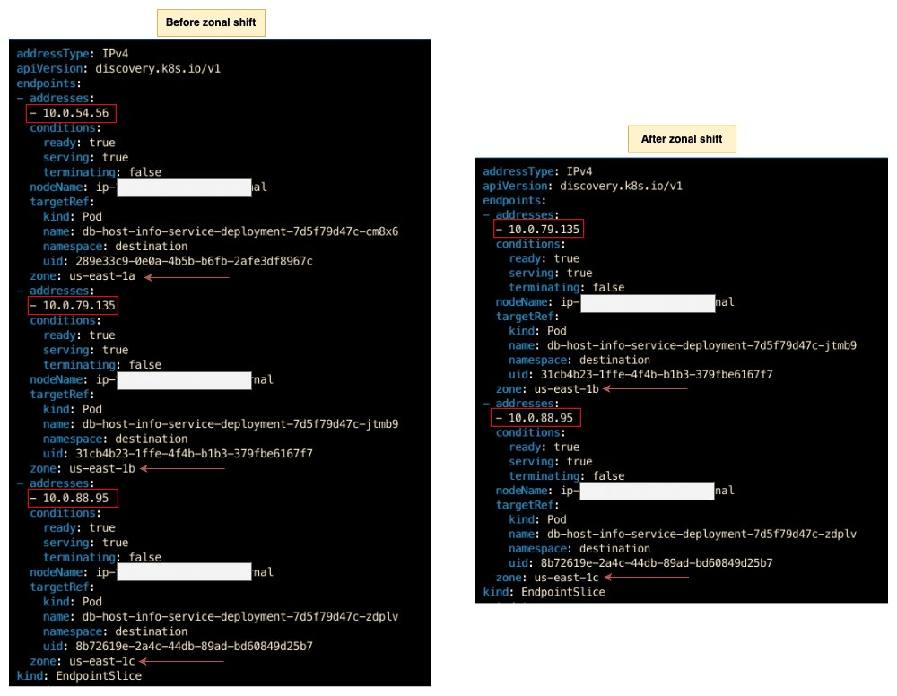 Sơ đồ sau đây cho thấy EndpointSlices cho Dịch vụ DB-Info trước và sau khi zonal shift được khởi tạo. Trước khi zonal shift, có ba điểm cuối, mỗi điểm trong một Availability Zone. Sau khi khởi tạo zonal shift, điểm cuối trong Availability Zone us-east-1a đã bị xóa khỏi EndpointSlice.