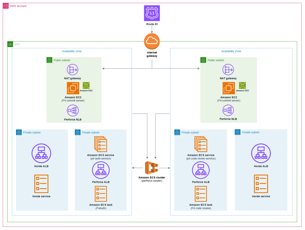 Sơ đồ kiến trúc mở rộng sau đây cho thấy cả Perforce và Horde đang chạy trên Amazon ECS với các dịch vụ AWS hỗ trợ.