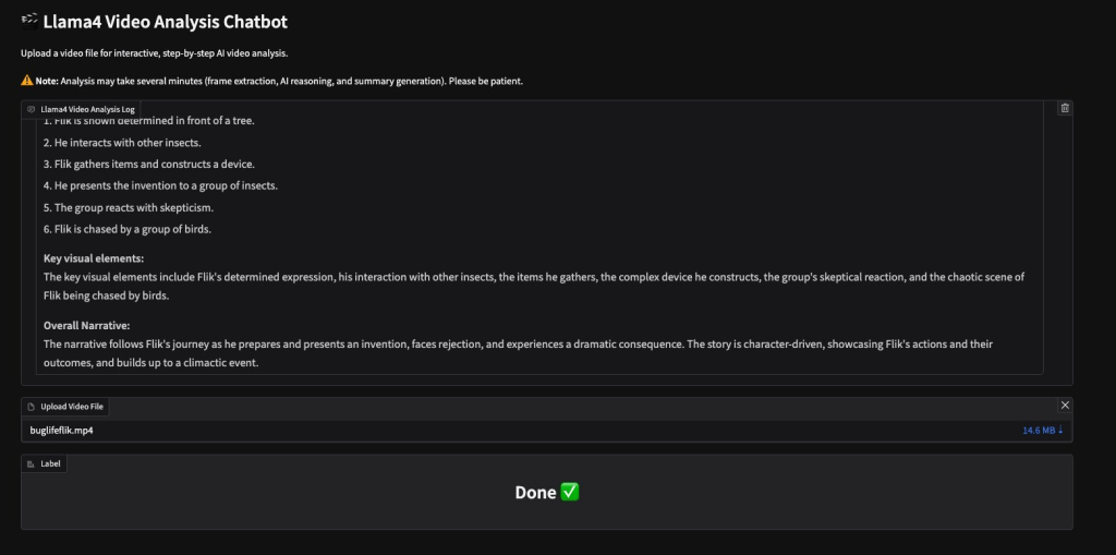 # Start the workflowagent = new_llama4_coordinator_agent()video_instruction = f"Process a video from {s3_video_uri}. Use tools in this order: run_frame_extraction, run_visual_analysis, retrieve_json_from_s3, run temporal_reasoning, run_summary_generation_ upload_analysis_results"response = agent(video_instruction)print(response)Tool #1: run_frame_extractionTool #2: run_visual_analysisTool #3: retrieve_json_from_s3Tool #4: run_temporal_reasoningTool #5: run_summary_generationTool #6: run_summary_generation**What happens in the video:**The video follows Flik as he navigates through a series of events, starting from being cautious in a natural setting, seeking help or communicating with other insects, participating in a crucial discussion or planning, and finally taking action with the group.**Chronological Sequence of Events:**The sequence begins with Flik being cautious near a tree, followed by him approaching a group of insects, then being part of a significant gathering or discussion, and concludes with Flik and the insects taking action together.**Sequence of events:**1. Flik is initially seen being cautious in a natural environment.2. He then approaches a group of insects, likely to communicate or seek help.3. A gathering of insects is shown with Flik at the center, indicating a crucial discussion or planning.4. The final scene shows Flik and the insects in action, possibly executing a plan or facing a challenge.**Key visual elements:**The key visual elements include Flik's cautious initial stance, his interaction with other insects, the gathering or discussion, and the final action scene, highlighting the progression from solitude to collective action.**Overall Narrative:**The narrative follows Flik's journey from caution and seeking help to participating in a crucial discussion and finally to taking action with a group of insects, suggesting a story arc that involves progression, planning, and collective action.Tool #7: upload_analysis_resultsThe video processing is complete. The final analysis results are saved to s3://sagemaker-us-west-2-333633606362/videos/buglifeflik/analysis_results_20250818_190012.json.The video processing is complete. The final analysis results are saved to s3://sagemaker-us-west-2-333633606362/videos/buglifeflik/analysis_results_20250818_190012.json.