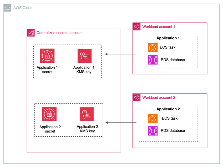- Bí mật do dịch vụ quản lý: Khi các dịch vụ như Amazon Relational Database Service (Amazon RDS) hoặc Amazon Redshift quản lý bí mật thay mặt bạn, các bí mật này được đặt trong cùng tài khoản với tài nguyên mà bí mật được liên kết. Để duy trì lưu trữ bí mật tập trung trong khi sử dụng bí mật do dịch vụ quản lý, các tài nguyên cũng phải được tập trung hóa.