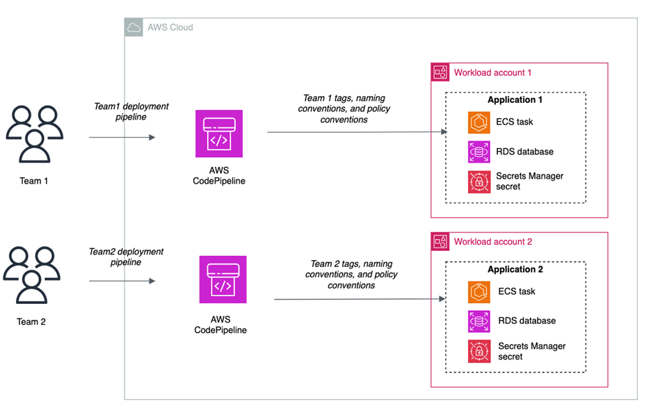 Ví dụ, một golden path có thể định nghĩa rằng một dịch vụ hoặc ứng dụng phải được xây dựng bằng AWS Cloud Development Kit (AWS CDK), chạy trên Amazon Elastic Container Service (Amazon ECS), và sử dụng AWS Secrets Manager để truy xuất thông tin xác thực cơ sở dữ liệu. Nhóm nền tảng cũng có thể xây dựng các kiểm tra để giúp đảm bảo rằng chính sách tài nguyên của bí mật chỉ cho phép vai trò được microservice sử dụng truy cập và được mã hóa bằng khóa do khách hàng quản lý. Mô hình này trừu tượng hóa việc triển khai khỏi các nhà phát triển và tạo điều kiện triển khai tài nguyên trên các tài khoản. Đây là một ví dụ về mô hình tạo tập trung, được thể hiện trong Hình 1.