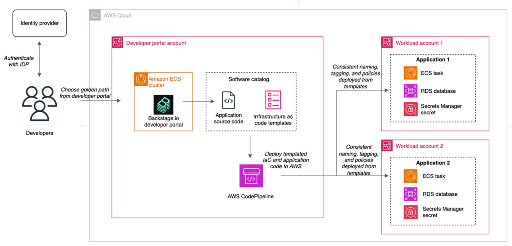 Một chức năng trung tâm duy trì các golden path này, chẳng hạn như một nhóm kỹ thuật nền tảng. Các ví dụ về dịch vụ có thể được sử dụng để duy trì và định nghĩa các golden path có thể bao gồm các dịch vụ AWS như AWS Service Catalog hoặc các dự án mã nguồn mở phổ biến như Backstage.io. Sử dụng phương pháp này, các nhà phát triển có thể tập trung vào mã ứng dụng trong khi các kỹ sư nền tảng tập trung vào triển khai cơ sở hạ tầng, kiểm soát bảo mật và công cụ dành cho nhà phát triển. Một ví dụ về golden path có thể là một triển khai được tạo mẫu cho một microservice ghi vào cơ sở dữ liệu.