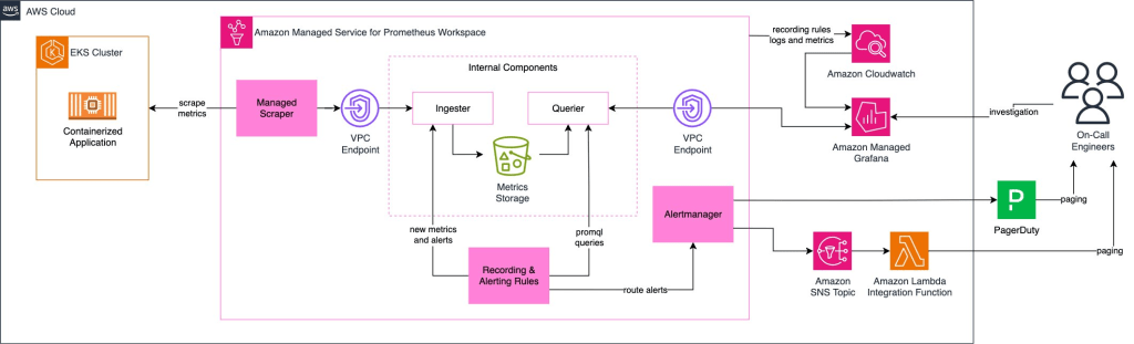 - Giới thiệu tích hợp trực tiếp PagerDuty: Ngoài lựa chọn gửi cảnh báo đến SNS, giờ đây khách hàng AWS có tùy chọn tích hợp Amazon Managed Service for Prometheus trực tiếp với PagerDuty, giảm độ phức tạp trong việc định tuyến cảnh báo.