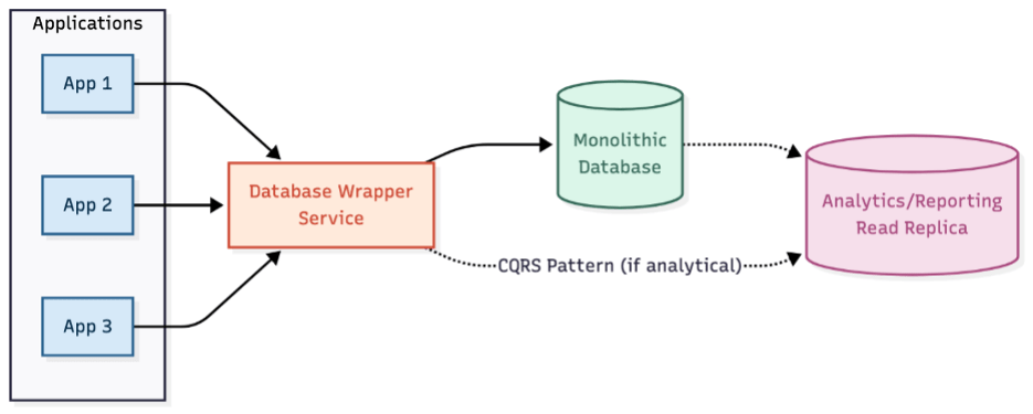 Hành trình bắt đầu bằng việc thiết lập quyền truy cập có kiểm soát vào cơ sở dữ liệu khối đơn nhất của bạn. Mô hình dịch vụ wrapper cơ sở dữ liệu tạo ra một facade trở thành cách duy nhất được ủy quyền để truy cập cơ sở dữ liệu. Điều này ngăn chặn sự phát triển không kiểm soát thêm trong khi cung cấp khả năng hiển thị vào các mẫu truy cập.