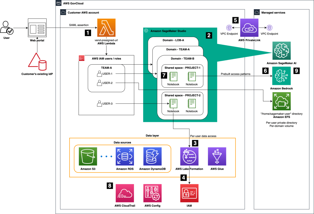 - Cách ly không gian làm việc – Amazon SageMaker AI trong AWS GovCloud (US) sử dụng các domain và shared space để cung cấp ranh giới tổ chức cho các nhóm và dự án, hỗ trợ phân tách giữa các phòng ban và các lĩnh vực kinh doanh dưới các cấu hình bảo mật, mạng và chính sách riêng biệt.