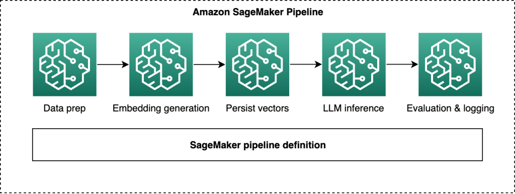 Đồ họa sau đây cho thấy một ví dụ về Amazon SageMaker Pipeline cho một quy trình làm việc RAG, hiển thị các bước tuần tự để chuẩn bị dữ liệu, tạo embedding, lưu trữ vector, suy luận LLM với các FM, và đánh giá và ghi nhật ký, tất cả đều được định nghĩa là các bước của SageMaker Pipeline trong một định nghĩa pipeline duy nhất.