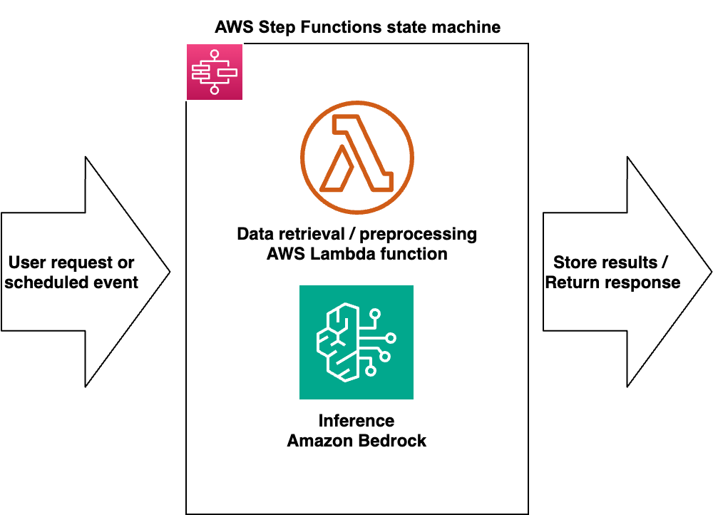 Đồ họa sau đây cho thấy một ví dụ về máy trạng thái AWS Step Functions cho một quy trình làm việc dựa trên Amazon Bedrock. Nó minh họa cách một yêu cầu người dùng hoặc sự kiện theo lịch trình kích hoạt một máy trạng thái điều phối một hàm Lambda để truy xuất và tiền xử lý dữ liệu và một bước gọi Amazon Bedrock để suy luận LLM trước khi lưu trữ kết quả hoặc trả về phản hồi.