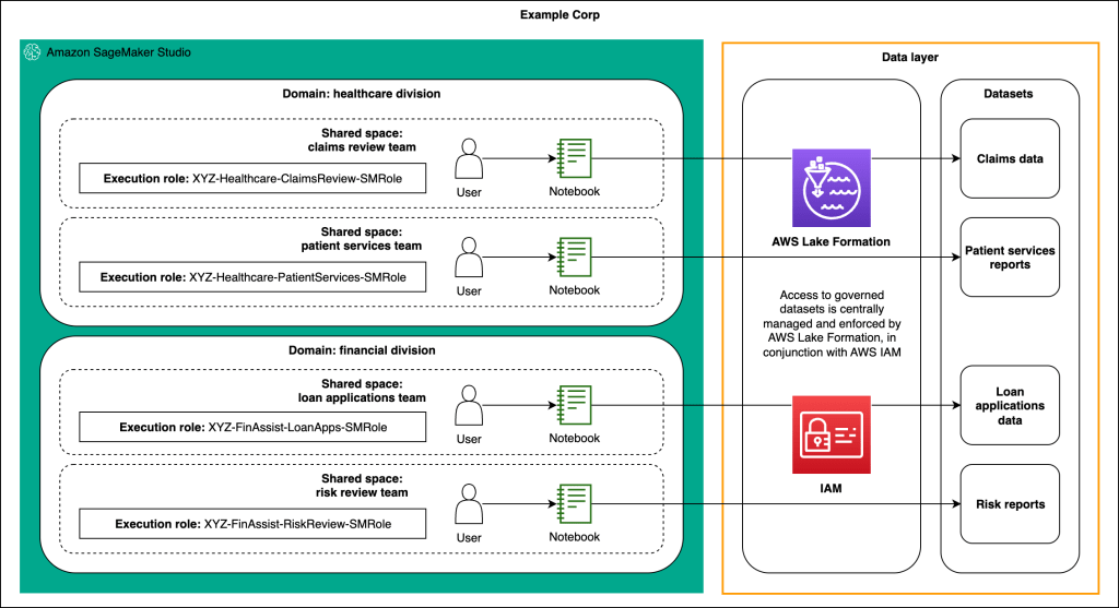 Hình 2: Ví dụ về bố cục tổ chức cho Example Corp sử dụng các domain và shared space của SageMaker Studio, hiển thị các domain chăm sóc sức khỏe và tài chính, mỗi domain có nhiều shared space sử dụng các vai trò thực thi riêng biệt được ánh xạ tới các tập dữ liệu được quản lý bởi Lake Formation.