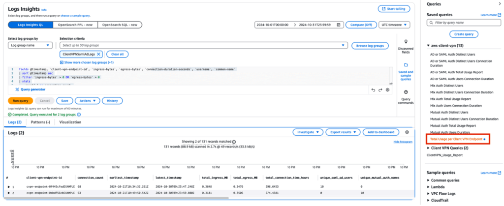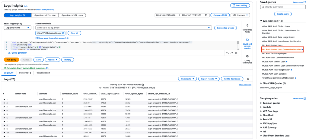 Khi được triển khai, bạn có thể tìm thấy các truy vấn đã lưu trong bảng điều khiển CloudWatch Logs Insights dưới thư mục đã chỉ định (aws-client-vpn). Từ đó, bạn có thể chạy và tùy chỉnh các truy vấn để tạo các báo cáo cần thiết, như được hiển thị trong Hình 3.