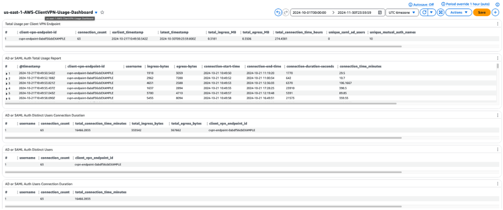 Bảng điều khiển CloudWatch mới được tạo cung cấp một cái nhìn toàn diện về các mẫu sử dụng Client VPN của bạn. Các bước sau đây chỉ ra cách tận dụng tối đa nó.