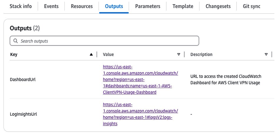 Hình 2: Tab Outputs của CloudFormation liên kết đến bảng điều khiển Log Insights