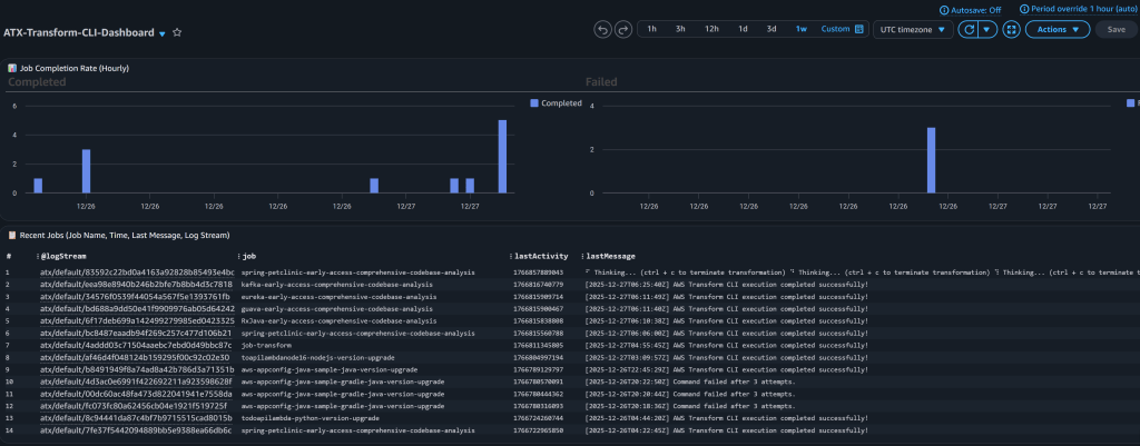 Tất cả các nhật ký được tập trung trong CloudWatch Logs (/aws/batch/atx-transform) với luồng thời gian thực.