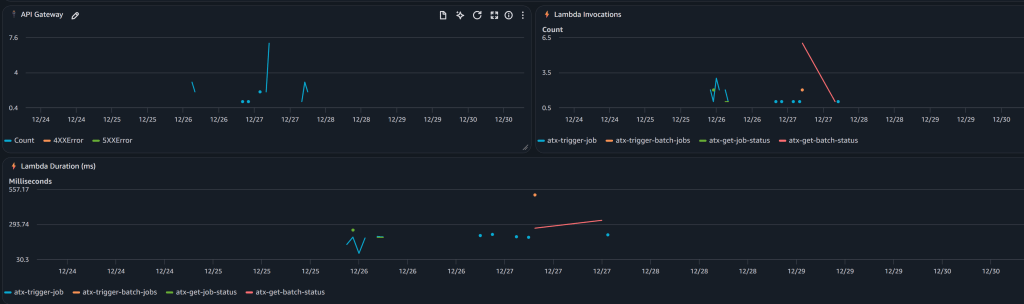 - Giám sát toàn diện Một CloudWatch dashboard cung cấp khả năng theo dõi job với tỷ lệ thành công và thất bại, xu hướng theo thời gian, và các chỉ số sức khỏe API và Lambda. Luồng nhật ký thời gian thực cho phép bạn giám sát tiến độ chuyển đổi và nhanh chóng chẩn đoán các vấn đề.