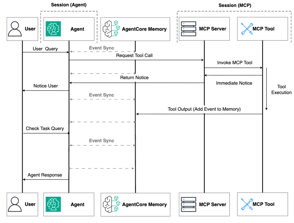 Với bộ nhớ ngoài, khi người dùng quay lại tương tác với tác nhân—dù là vài phút, vài giờ hay vài ngày sau—tác nhân có thể truy xuất kết quả tác vụ đã hoàn thành từ bộ nhớ bền vững. Cách tiếp cận này giảm thiểu sự phụ thuộc vào thời gian chạy: ngay cả khi cả máy chủ MCP và các instance tác nhân bị chấm dứt, kết quả tác vụ vẫn được bảo toàn an toàn và có thể truy cập khi cần.
