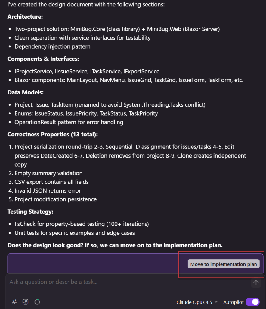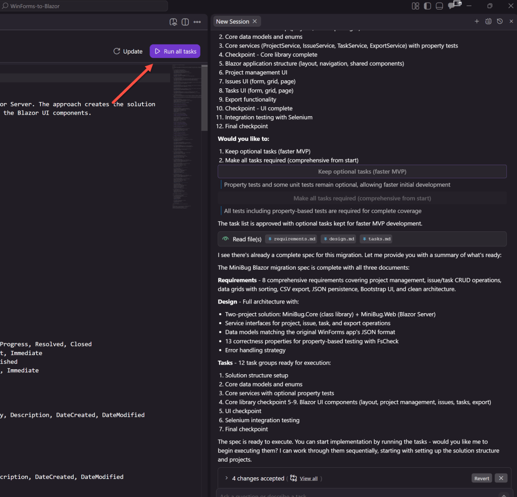 Ở giai đoạn này, chúng tôi đã thực hiện một số điều chỉnh đối với các yêu cầu của mình thông qua các lời nhắc để củng cố các tiêu chí chấp nhận xung quanh thiết kế Blazor, đặc biệt đảm bảo rằng không có thành phần Windows Forms gốc nào được tạo lại trong Blazor và các yếu tố thiết kế web phổ biến được sử dụng thay thế. Sau khi hài lòng, chúng tôi đã chọn Move to design phase để khóa các yêu cầu và tiến lên. Tài liệu yêu cầu vẫn có thể chỉnh sửa được trong suốt quá trình — chúng tôi có thể quay lại và tinh chỉnh nó nếu giai đoạn thiết kế tiết lộ bất kỳ khoảng trống nào.