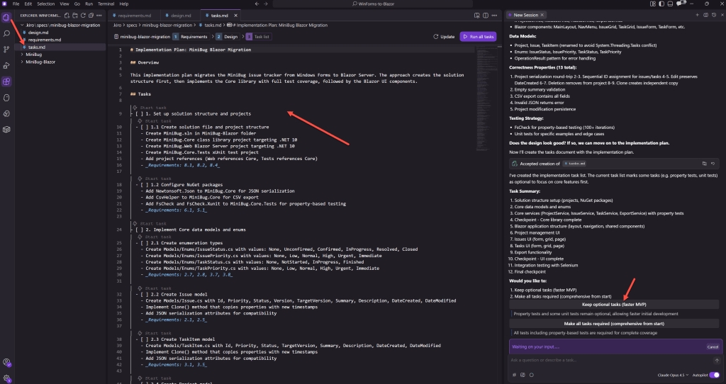 Kiro sau đó đã chuyển đổi thiết kế thành một danh sách tác vụ có thể thực hiện được. Mỗi tác vụ tham chiếu các yêu cầu cụ thể để truy xuất nguồn gốc và bao gồm các điểm kiểm tra tại các điểm chiến lược để xác thực. Bạn cũng sẽ nhận thấy các tác vụ được đánh dấu là tùy chọn theo mặc định — chẳng hạn như các bài kiểm thử dựa trên thuộc tính — mặc dù bạn có tùy chọn thay đổi bất kỳ tác vụ nào trong số đó thành bắt buộc. Giữ chúng tùy chọn cho phép bạn di chuyển nhanh hơn đến một MVP mà không phải hy sinh khả năng thêm chúng trở lại sau này.