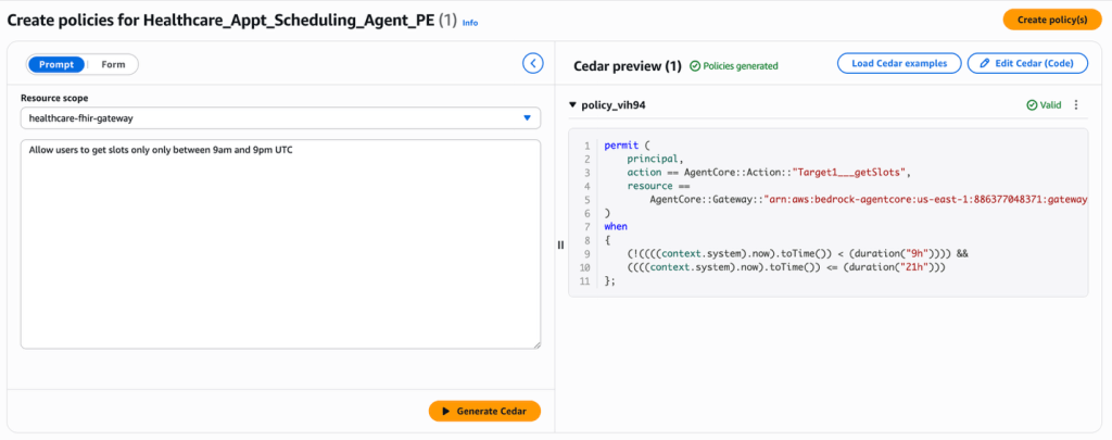 Ngoài kiểm soát truy cập, Chính sách có thể thực thi các quy tắc kinh doanh hoặc các mẫu nguy hiểm giúp ngăn chặn lạm dụng. Bằng cách sử dụng các lệnh forbid rõ ràng để chặn cứng các mẫu đầu vào nguy hiểm cho các công cụ, bạn có thể bảo mật ứng dụng của mình ngay cả khi tác nhân bị xâm phạm. Ví dụ, hãy tạo một chính sách để chặn hiển thị các khung giờ hẹn ngoài giờ giới hạn. Trong hình ảnh sau, bạn có thể thấy rằng câu lệnh ngôn ngữ tự nhiên “Cho phép người dùng lấy các khung giờ chỉ từ 9 giờ sáng đến 9 giờ tối UTC” được chuyển đổi thành chính sách Cedar.