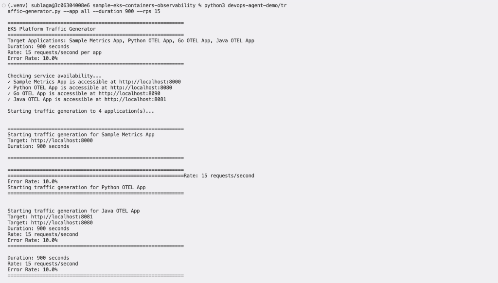 Ảnh chụp màn hình đầu ra terminal hiển thị quá trình khởi tạo một script EKS Platform Traffic Generator nhắm mục tiêu bốn ứng dụng OTEL — Sample Metrics App, Python OTEL App, Go OTEL App và Java OTEL App — mỗi ứng dụng được cấu hình trong 900 giây với 15 yêu cầu mỗi giây và tỷ lệ lỗi 10%. Tất cả bốn dịch vụ đều được xác nhận khả dụng tại các cổng localhost tương ứng của chúng.